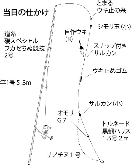 この常連さんはグレ狙いで、「ハリスは1.2号、針はチヌ鈎の0.8号。サシエは石ゴカイ。ウキ下は1ヒロほどハワせる大ズラシ」だと言う。