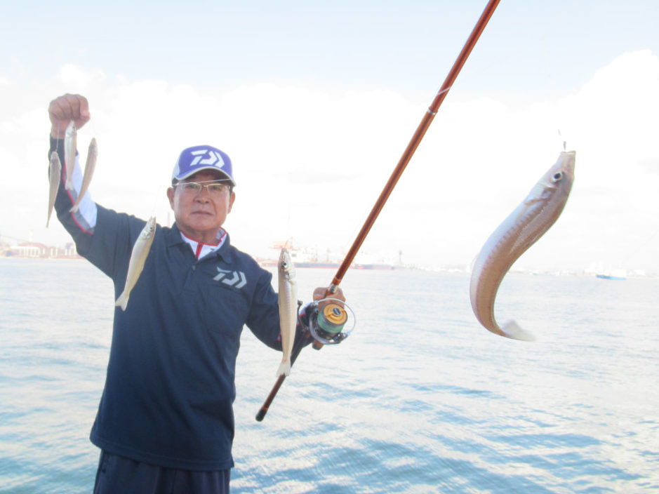 釣友の山根氏もダブル、トリプルと連続ヒットし、潮が港内に流れ出した14時頃にはブルン、ブルルン、ギューンと大きなアタリがあり、「これは重いぞ」と慎重に浮かせると、16~20cmの6連と、ビックリの釣果。