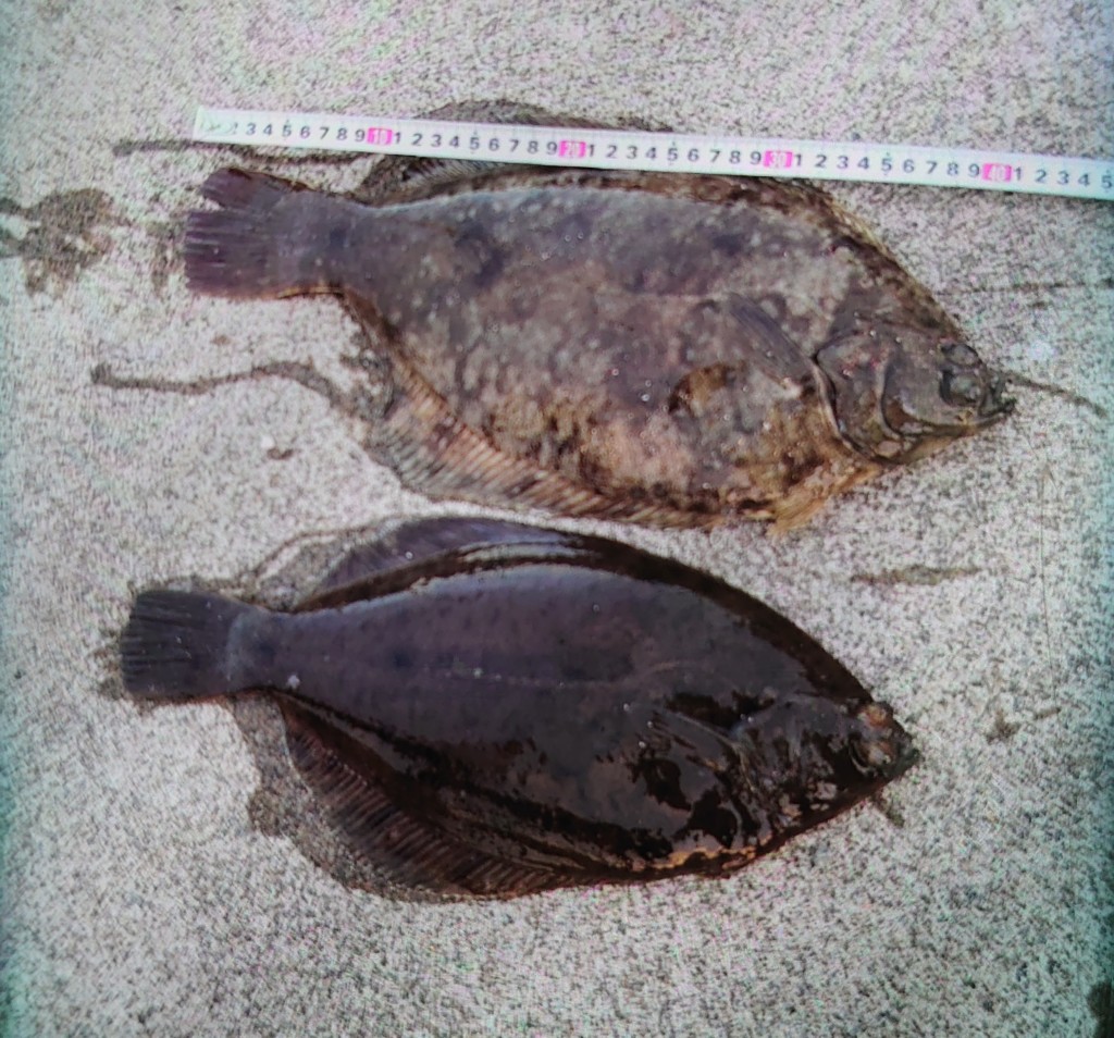 東二見人工島でカレイ42cm頭に2尾とカワハギ23cm頭に3尾。