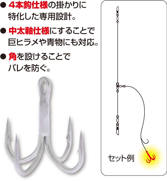泳がせ仕かけの孫針として使用しますが、その針数は従来のトリプルではなく、フォース。