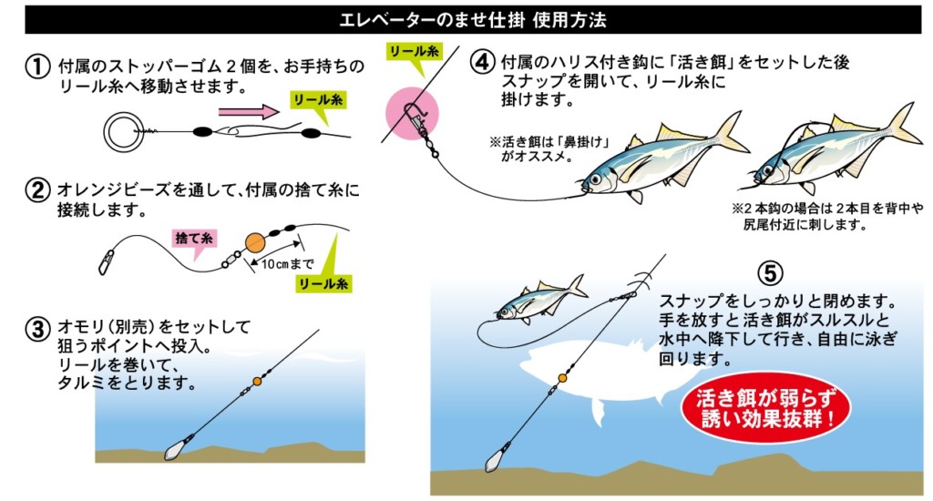 この「エレベーターのませ仕掛」はその名の通り、活きエサを弱らせずに元気に泳がせることで誘うことができる仕掛けです。