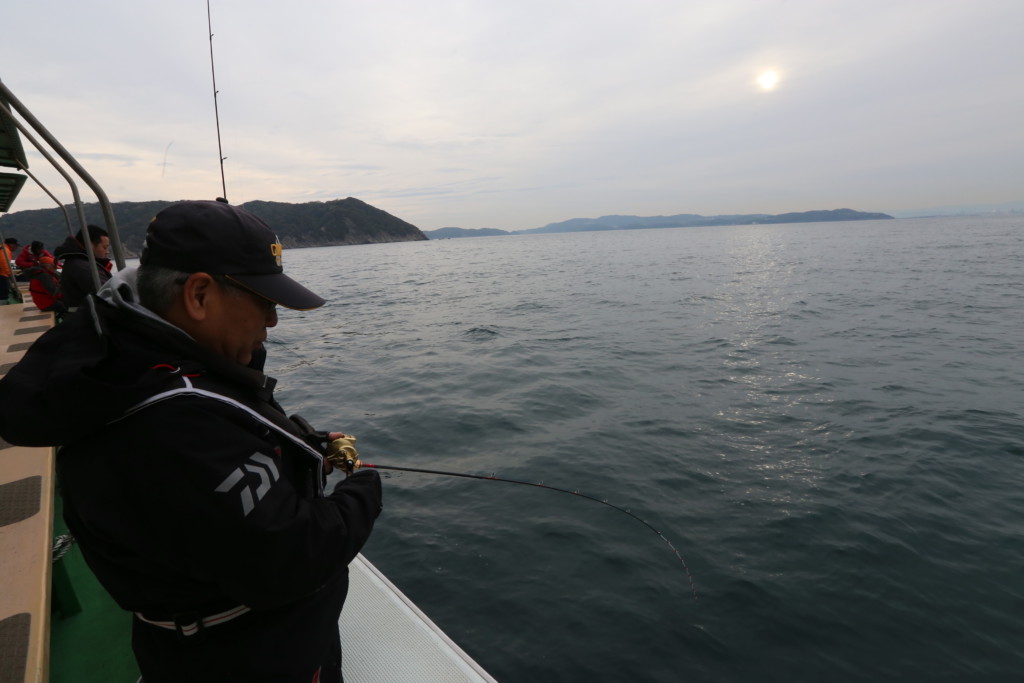 当日は朝5時に出船しました。ポイントは航程10分前後の水深40m前後の田倉崎沖から、港から20分ほどの水深100m近くあるコイヅキまで広範囲でした。
