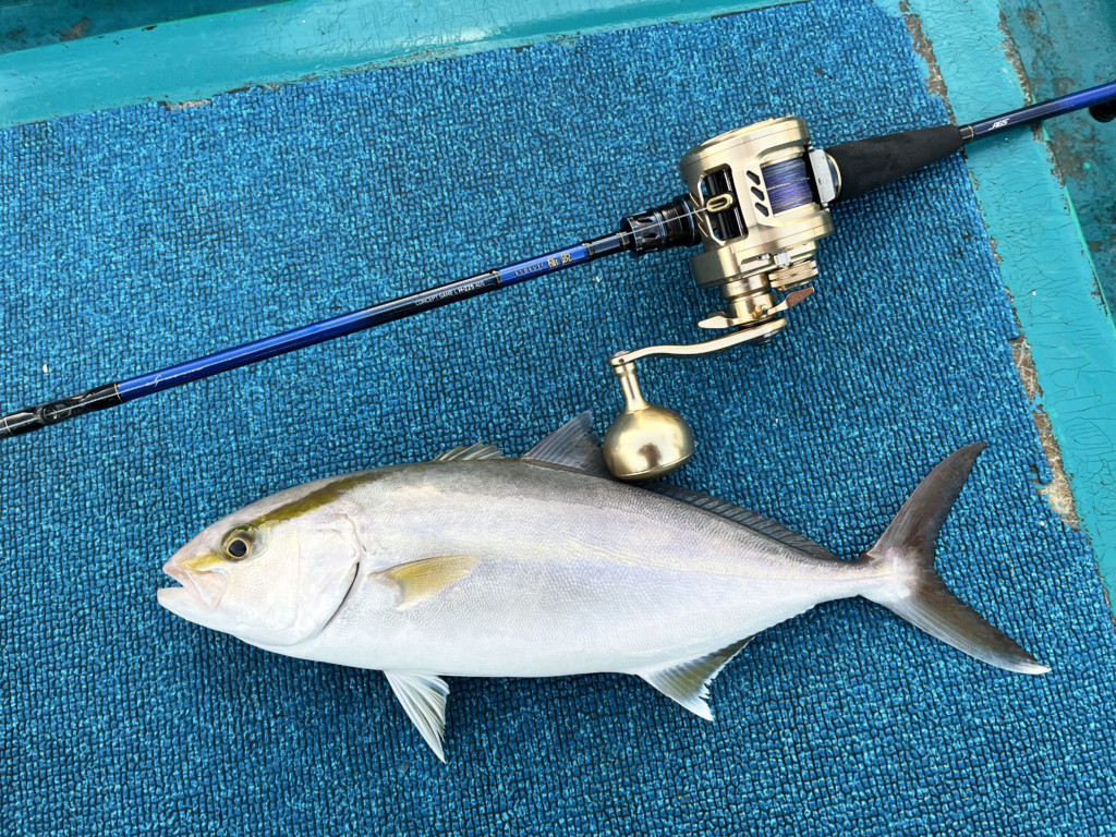 軽量手巻きタックルを活かして、やり取りを楽しみつつ上げてきたのは、カンパチの幼魚、当地では「シオ」と呼ばれるサイズです。