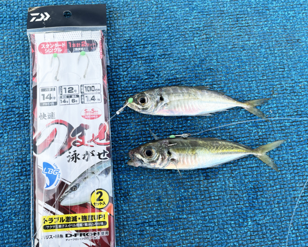 生きエサを使うので勝手に誘ってくれそうですが、水中ではハリスと針の重さの影響もあり、思ったほどエサは動いていません。また、一定の動きをしているエサは、フィッシュイーターに追われにくい傾向にあります。