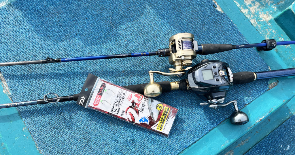 和歌山・丸浩丸で白浜沖60~110mのポイントを狙います。浅場は手巻きリール&軽量タックルで、深場は電動リール&落とし込みタックルで攻略です。