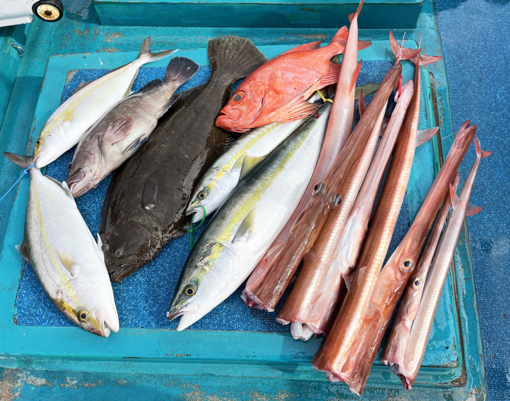 しかし深場も潮が動かず、アタリがでない時間が続きます。たまに上がってくる魚も、アカヤガラやチカメキントキと、潮が動いていない時に釣れる魚たち…(汗)。