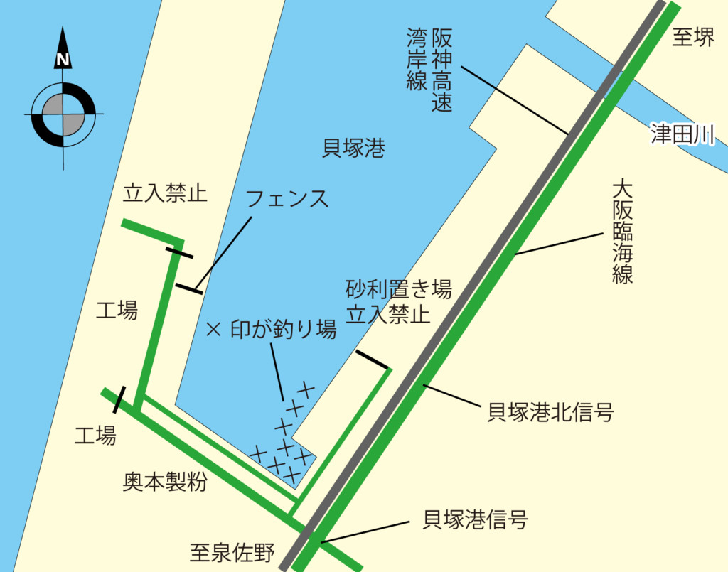 大阪臨海道路の貝塚港の信号を西へ入ると、すぐの右手が釣り場。