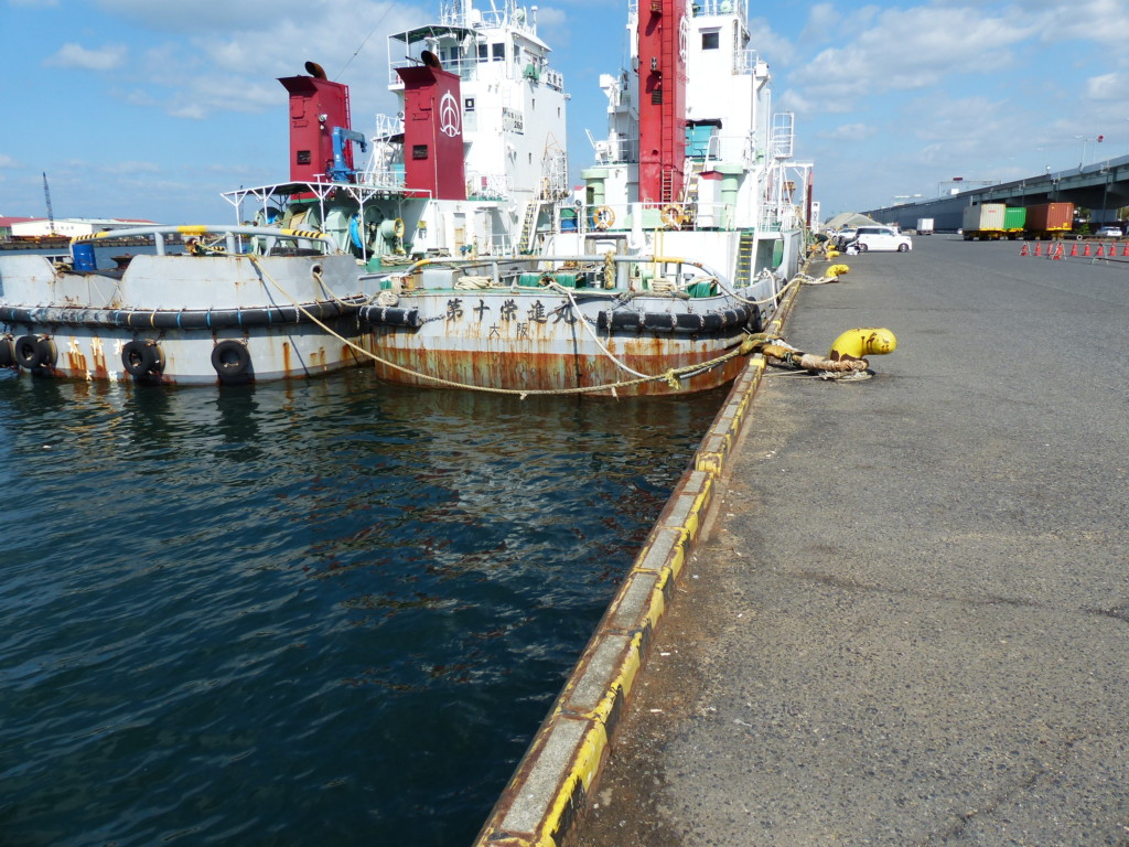 ▲タグボート、クレーン船、貨物船が停泊している岸壁