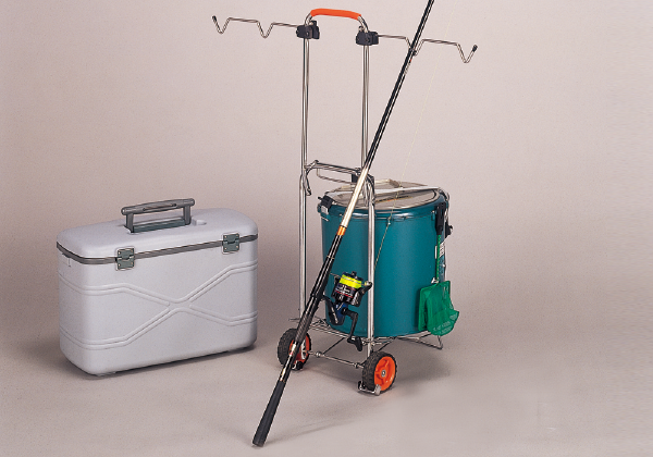 昌栄の「キャリー竿掛」は釣具を運ぶキャリーに取り付けられ、付けたままハンドルの収納もできるスグレモノです。