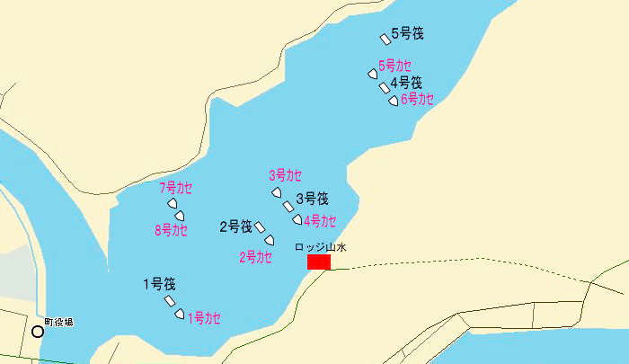 ロッジ山水では、河口、山水前、奥の3つのブロックに分かれて、筏、カセを設置。