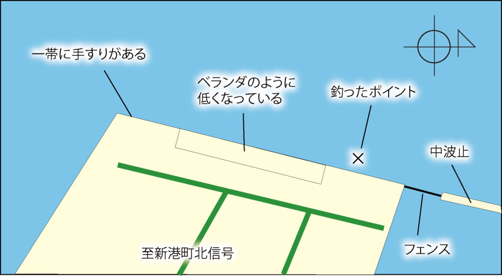 釣行当日のサヨリ釣りは、ベランダから北の高場で釣ったが、サヨリは帯で釣れている。