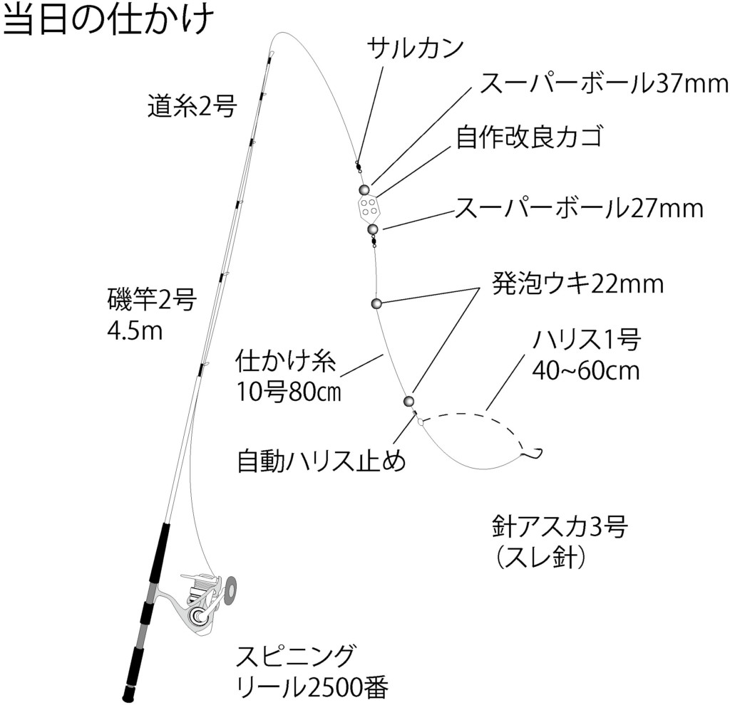 竿は2号の4.5m、スピニングリールに道糸2号、自作の遠投カゴの連玉仕かけ。