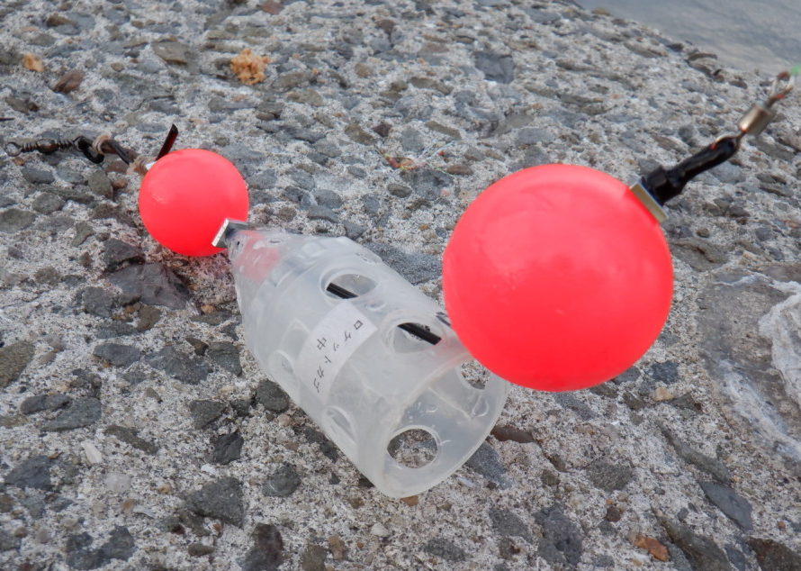 カゴに入れるマキエは米糠とアミエビで、サシエはイカを細く小さく切ったもの。