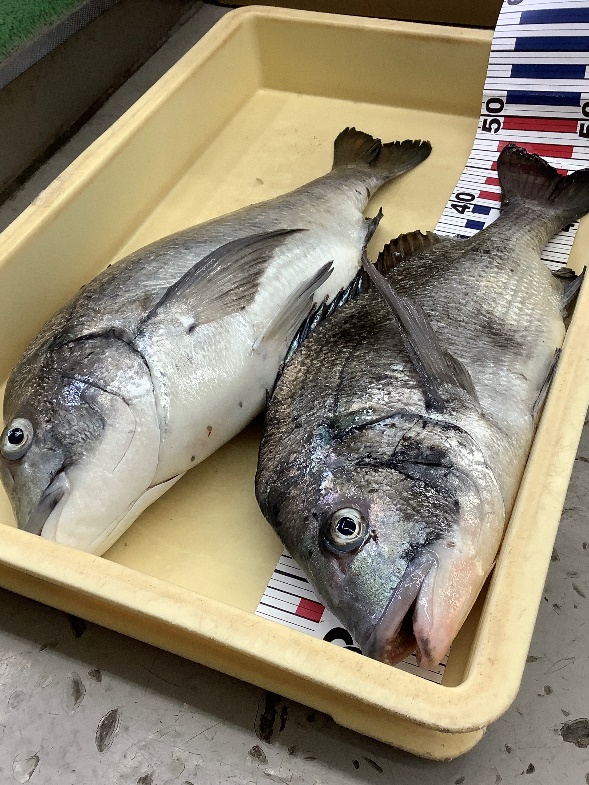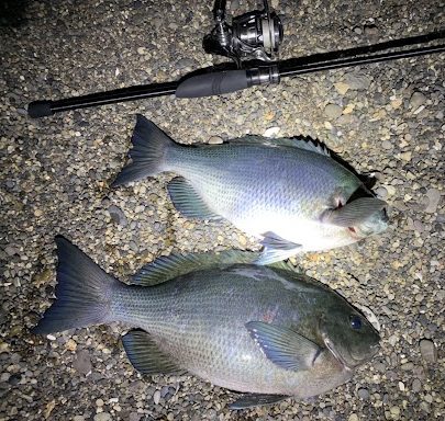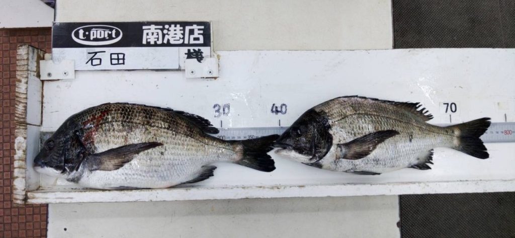 舞洲周辺で石田氏チヌ40.2cm頭に2尾をオキアミのフカセ釣りで。
