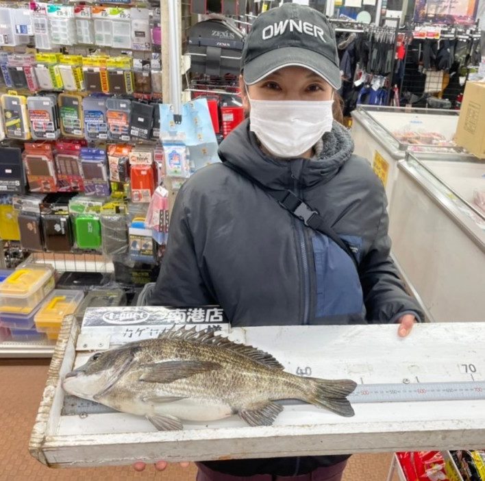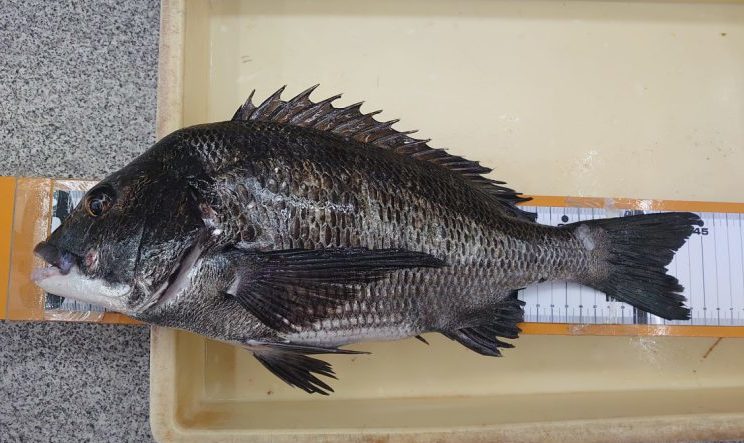 シーサイドコスモでカゲヤマさんチヌ49.1cmを地エビのズボ釣りで。