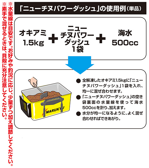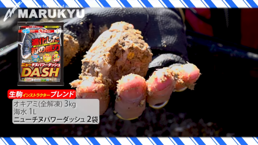 オススメの配合は、ニューチヌパワーダッシュ1袋に対して、オキアミ1.5kgと海水500cc。