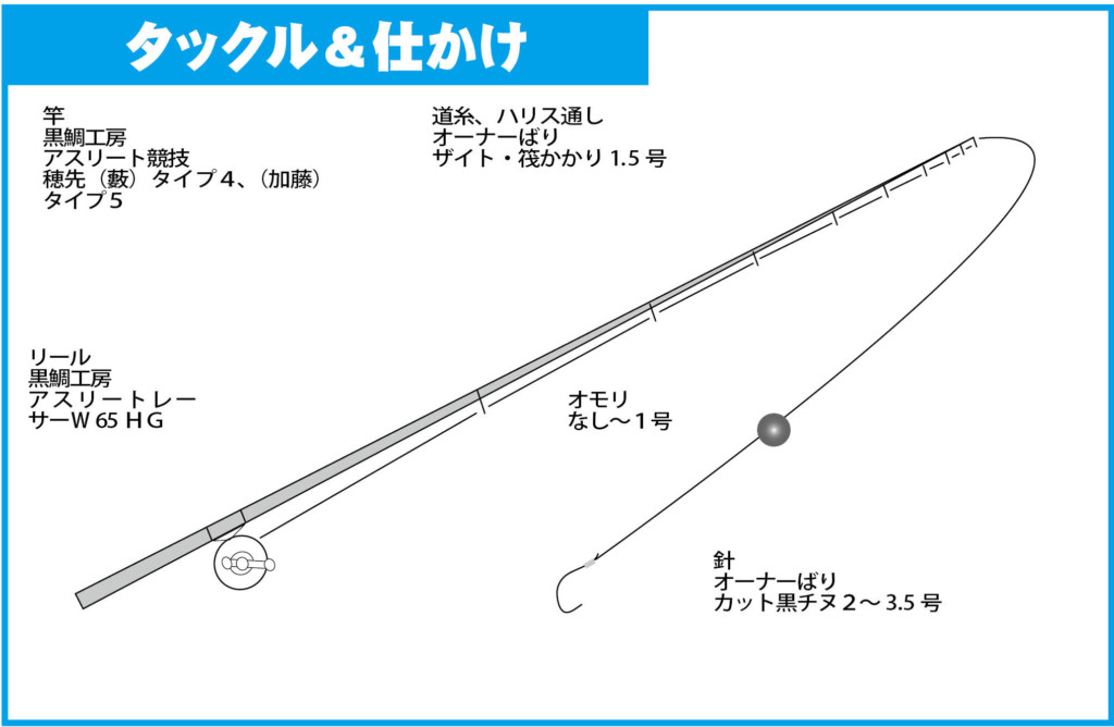 タックルはカカリ釣り用のチヌ竿に、リールは送り込みなどのライン操作が容易な片軸リール。