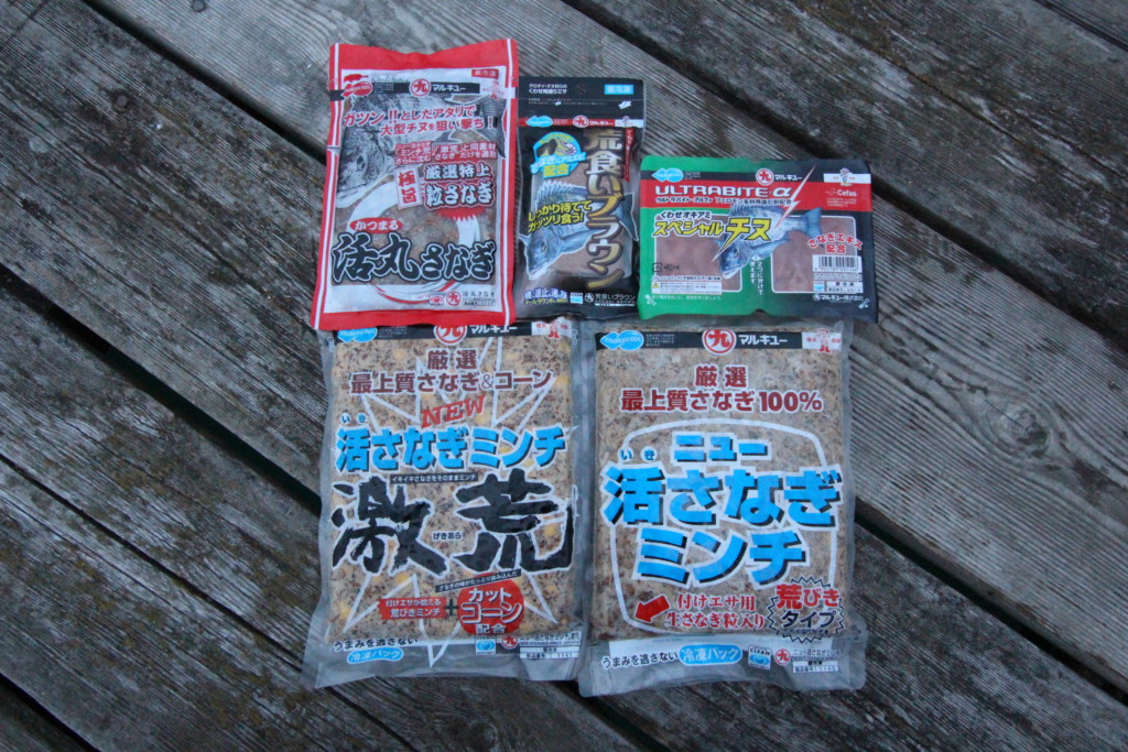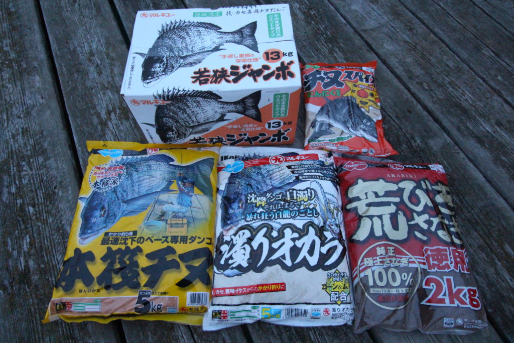 その配合は、1日分でマルキユーの若狭ジャンボ2箱、ニュー活さなぎミンチ2袋、本筏チヌ1袋、濁りオカラ1袋、荒びきさなぎ1袋、チヌスパイス1袋で、これら全て4分の1ずつをまぜ合わせて、アミエビ400gに海水をカップ(660㏄)4ハイを入れて満遍なくまじるように練り込んだ。