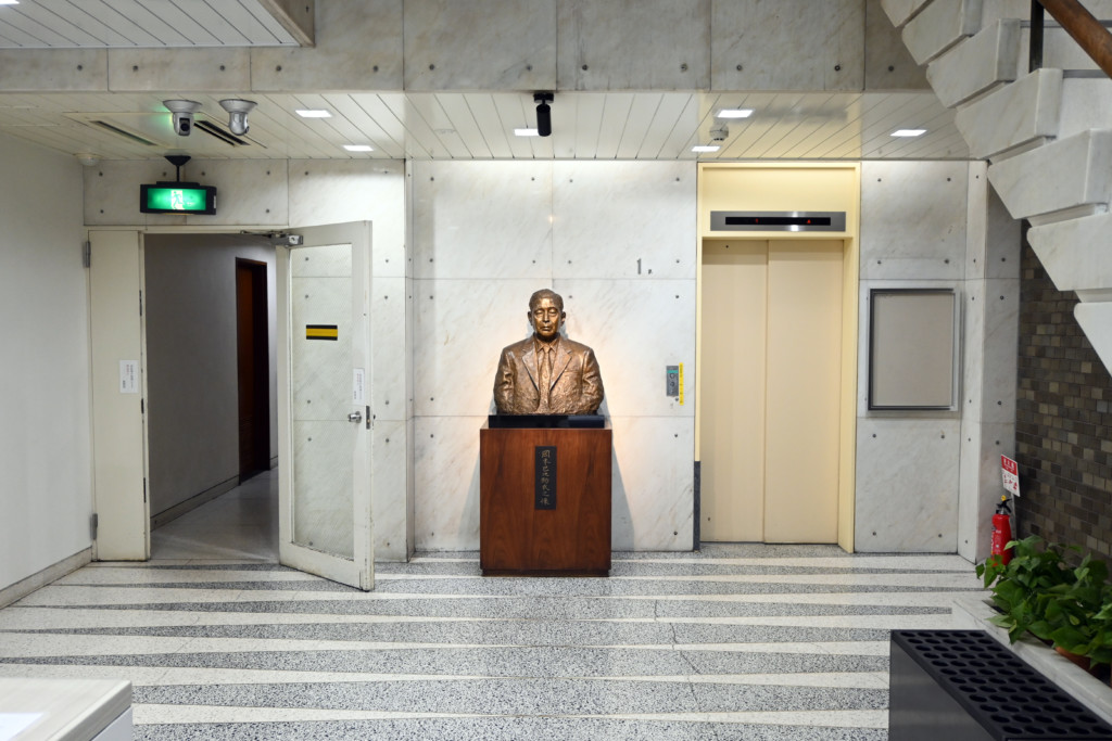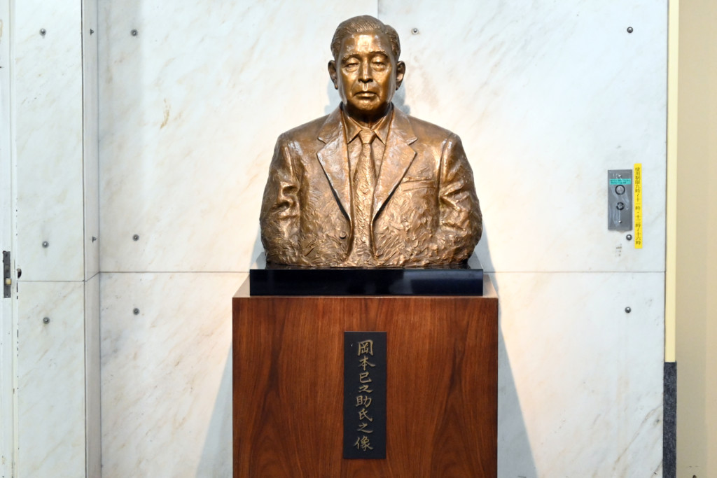 玄関を入ると、創業者である岡本巳之助氏のオブジェが出迎えてくれた