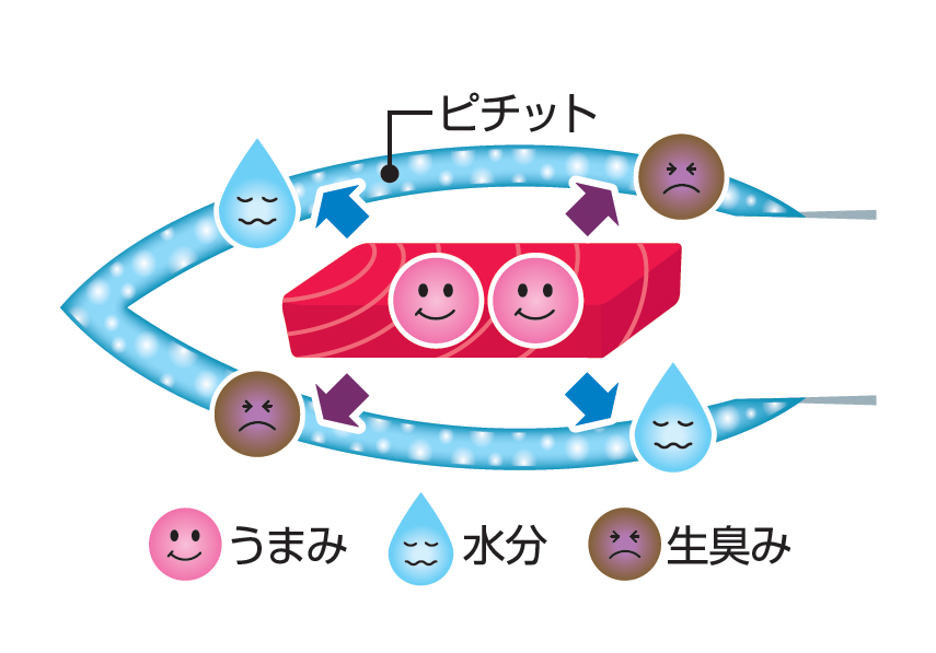 魚が美味しくなる仕組み(ピチットと食材との濃度差により、浸透圧が働き、水分がピチットに移行)は以下。