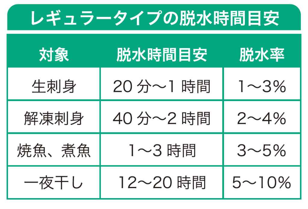 では具体的に、魚種や調理ごとの脱水時間はどれくらいがよいのでしょうか?