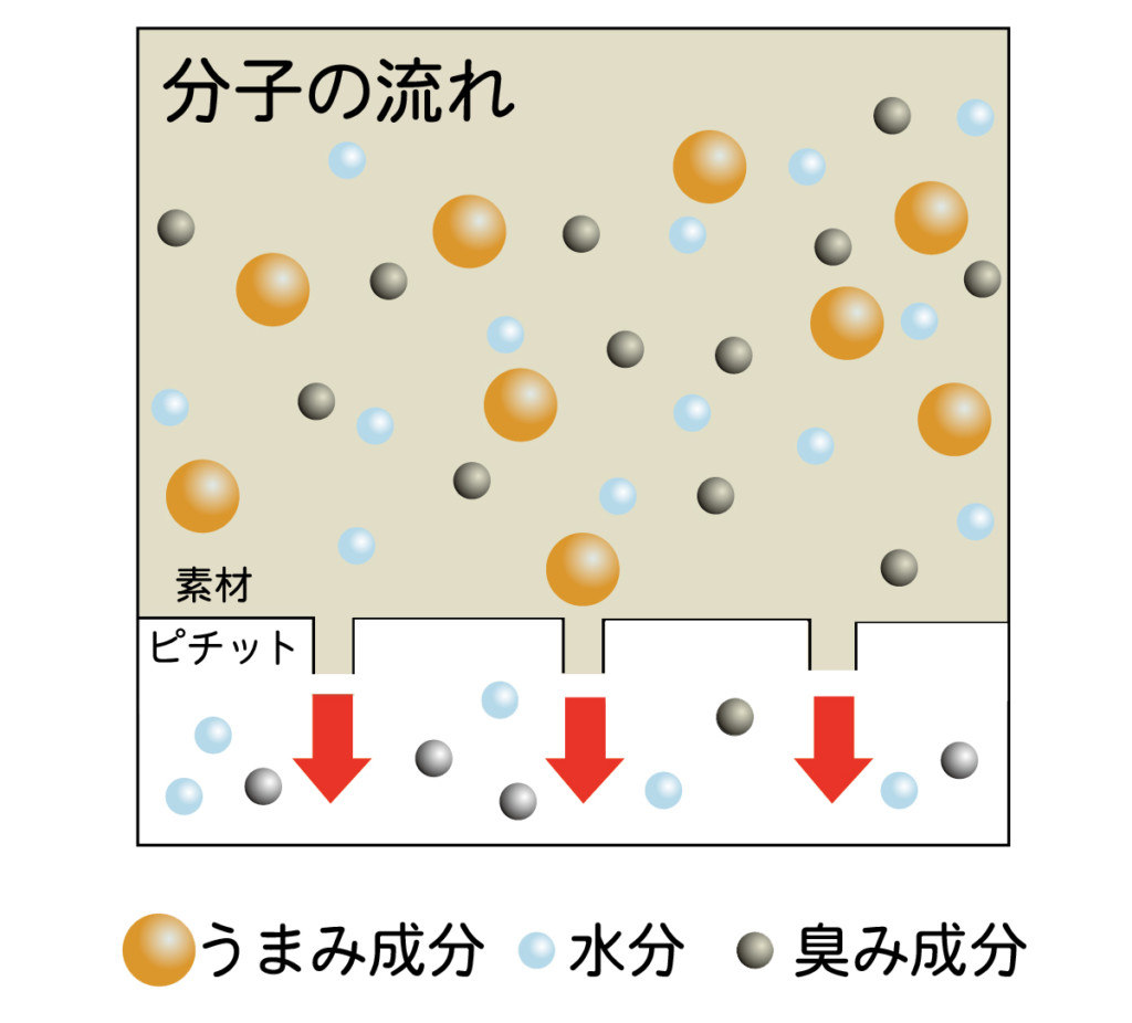 ピチットは、目に見えないほどのヒジョ~~に小さな穴が空いた2枚の特殊な食品用半透膜フィルムに、高濃度の水あめ成分や吸収した水分を保持する海草成分(糊料)が挟まれる構成。