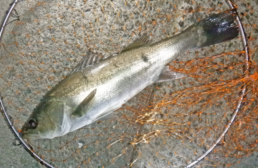 ひと息待って合わせると、竿にグイ、グイーっときて沖へ走り、小さくバシャッとエラ洗い。