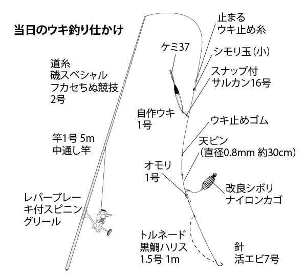 18時頃からハネを狙って、図のような仕かけで、まずは底から30cmほど上のタナで釣り始める。