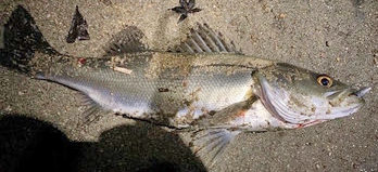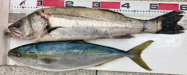 かもめ大橋周辺でスズキ62cm、ハマチ51cm。