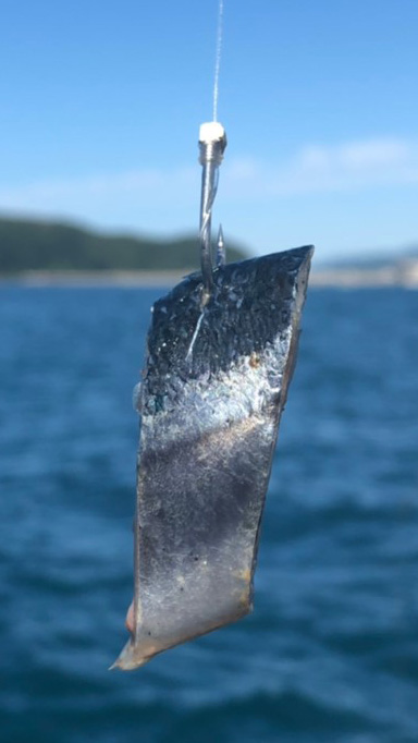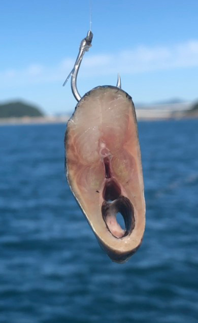 日が完全に昇ってからは揺れてキラキラ光る斜め切りが食い渋り時にオススメのエサの付け方です。