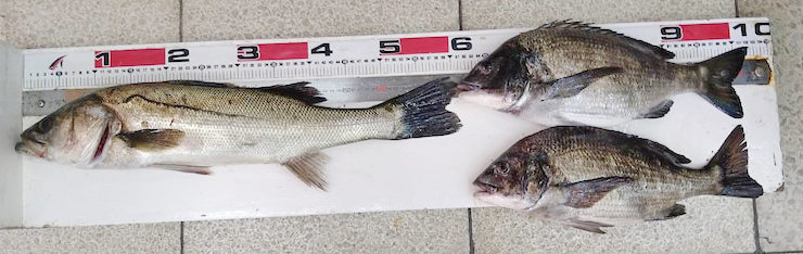 姫路・高砂の河川各所でチヌ45cm頭に3尾、シーバス60cm頭に3尾をルアーで。