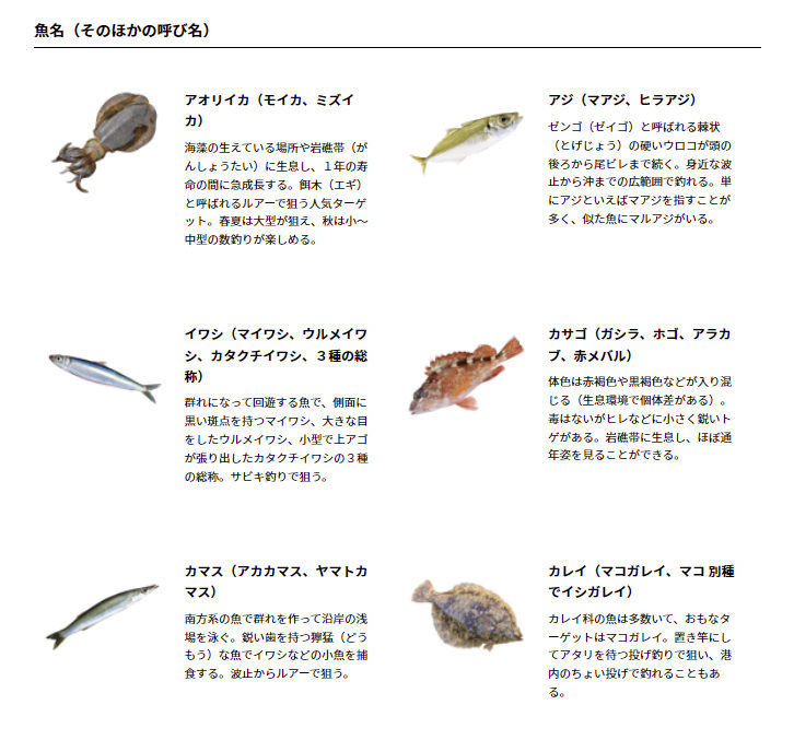 どんな魚が釣れるのか、どこで魚釣りを楽しめばよいか、必要な道具、マナーなど、初めて魚釣りに触れる方が、魚釣りを楽しめ、そして魚釣りを好きになって欲しいという想いの詰まったコンテンツとなっています。