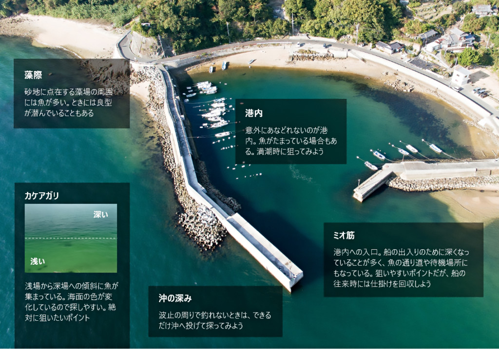 釣り場選びは重要な項目のひとつ。足場がよくて安全な波止(堤防)や岸壁。河口周辺も海に近い場所は魚種が豊富で、浜も釣りやすい場所。
