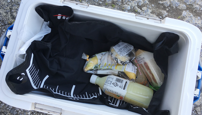 Mサイズは、地面にちょっと大きめのモノを置く時や、写真のようにクーラーの中で食品と氷などと分けるために使ったりできます。