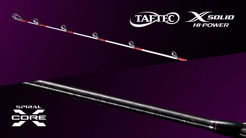また、ついばみバイトを弾くことなく、食い込みへと繋げるタフテック∞をカーボンテープで強化したハイパワーXソリッドを採用した穂先と、「スパイラルXコア」採用のブランクスで、ベリーからバットにかけて硬く、強く仕上げることにより誘いやすさ、フッキングとファイトにおける操作性も最高です。