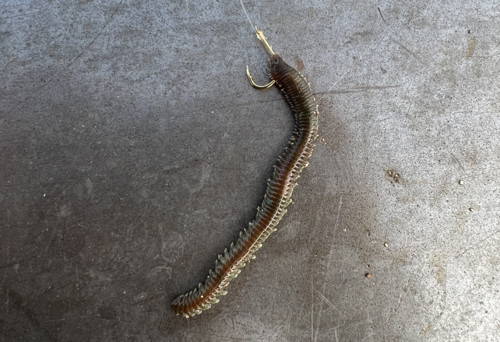 シロアマダイは雑食のため、さまざまなエサが使えるが、串本沖では”青イソメ”がよいそうだ。
