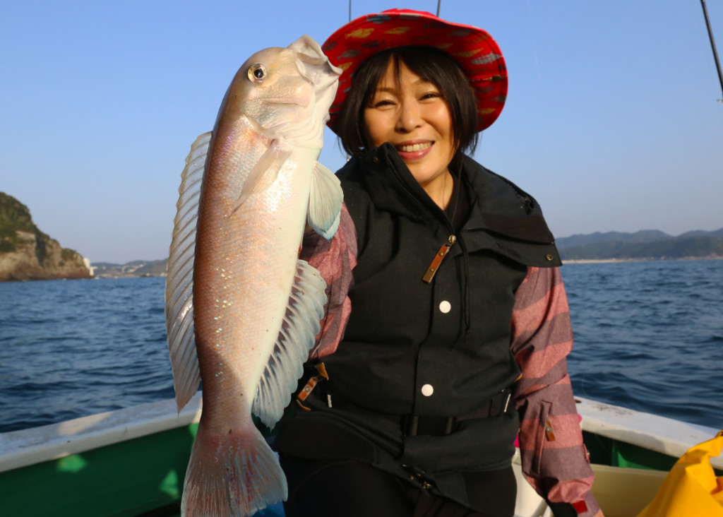 朝は潮も風もない状況で、食いが渋くエサも取られない。そんな中、船中ファーストヒットさせたのは、つりそくでもお馴染み、”美味魚ハンター けーちん”こと、川森慶子さん。小気味よい引きを楽しみながら上がってきたのは、36cmのシロアマダイ。