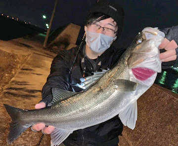 食品コンビナートでアジ30cm頭に2尾、シーバス73cmをルアーで。