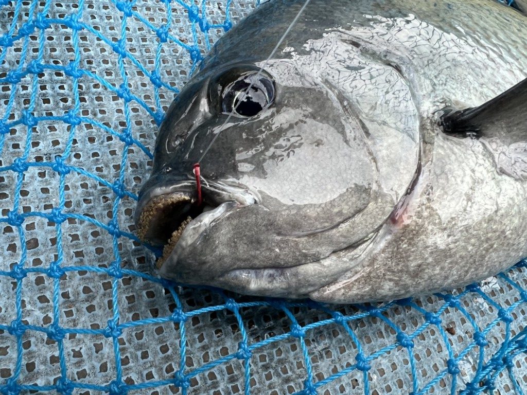 養殖エサのペレットをエサにウキ、ズボで狙う