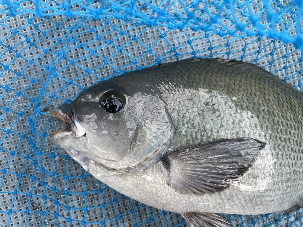 竿を絞り込むような力強い引きを楽しみながら上がってきたのは、先ほどよりもひと回り大きいグレ。計ってみると、ジャスト40cm! 見事な体高のグレでした。