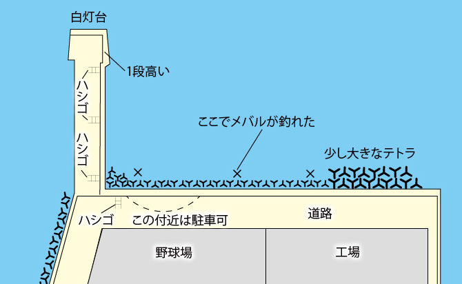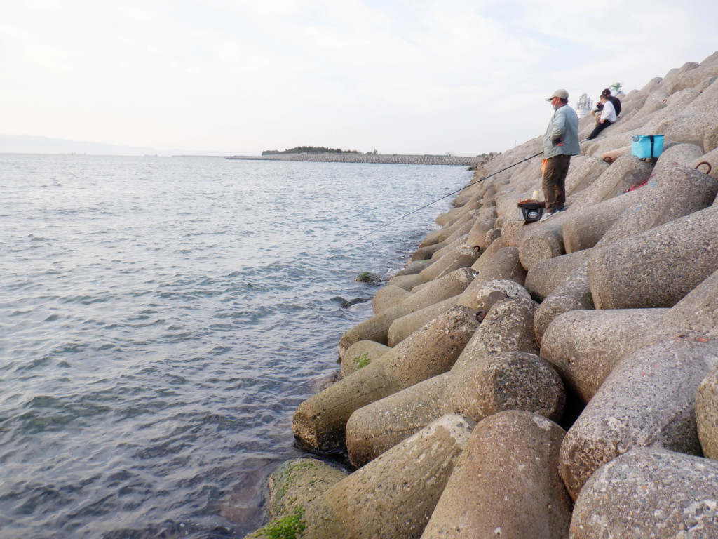 このテトラ帯の前がポイントで、テトラは小さめなので、幾分歩きよく、足場のよい場所を選ぶと腰を掛けて釣りができる。