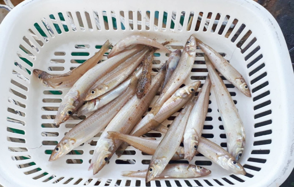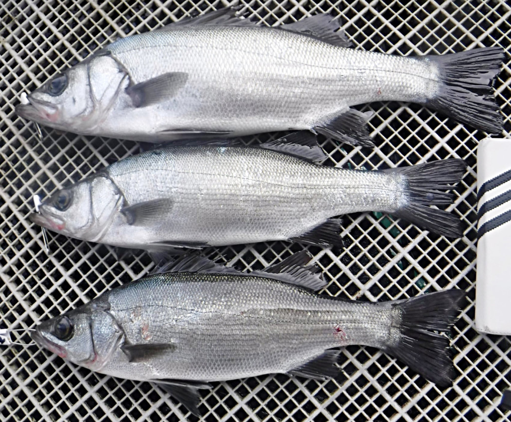 セイゴ41.5cm頭に3尾、バリ37cm頭に4尾、キジハタ32㎝頭に3尾、クロ31cm頭に378尾、アジ29cm頭に2405尾、タカノハダイ25cm、キス25cm頭に27尾、カサゴ25cm頭に368尾、メバル24cm頭に32尾、ベラ23cm頭に28尾、サンバソウ22cm頭に2尾、トウゴロウイワシ1300尾、サバ13cm頭に7345尾、イワシ13cm頭に2550尾。