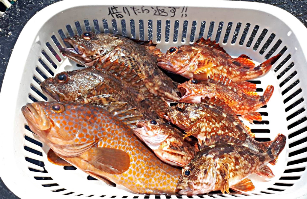 アオリイカ胴長30cm、クロ30cm、アジ50尾、サバ12cm頭に100尾、イワシ12cm頭に50尾、スズメダイ13cm頭に20尾、メバル20cm、カサゴ20cm頭に5尾、キス20cm頭に3尾。
