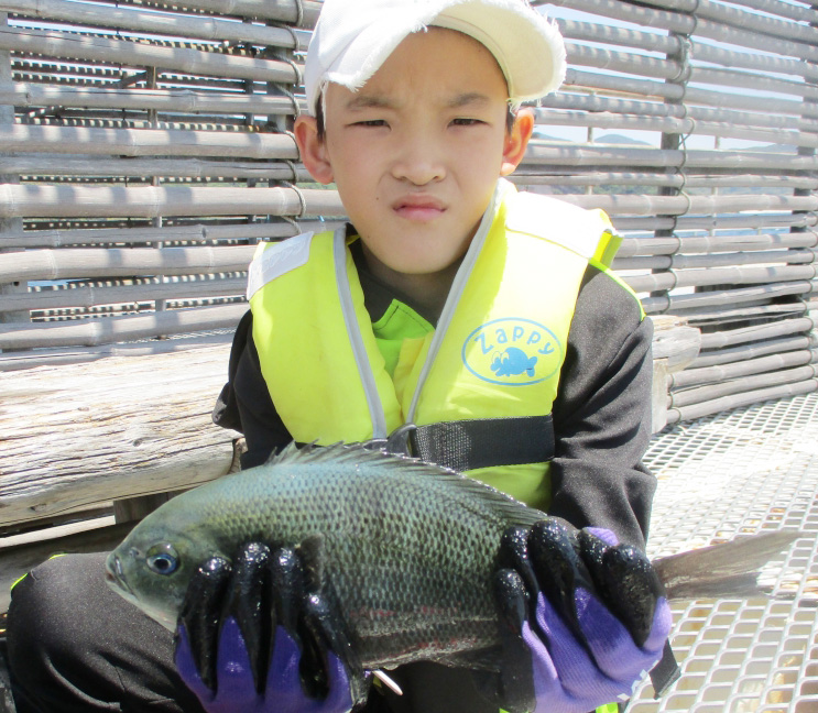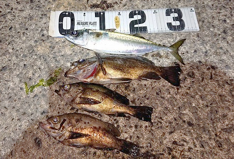 クロ24cm頭に2尾、イシダイ20cm、アジ300尾、サバ10cm頭に200尾、イワシ11cm頭に150尾、スズメダイ13cm頭に50尾、カサゴ20cm頭に3尾、メバル18cm。