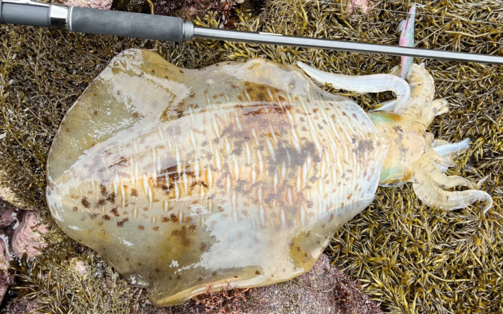 有田周辺の地磯ではアオリイカ2.03kgが釣れていた。