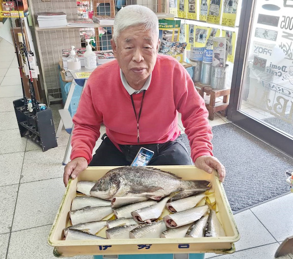 南港周辺で北川氏コノシロ28cm頭に19尾とチヌ45cmをサビキ釣りで。