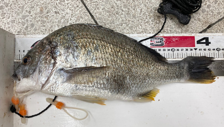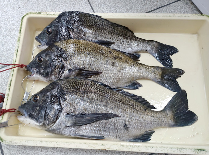 かもめ大橋でチヌ50cm頭に3尾を落とし込み釣りで。