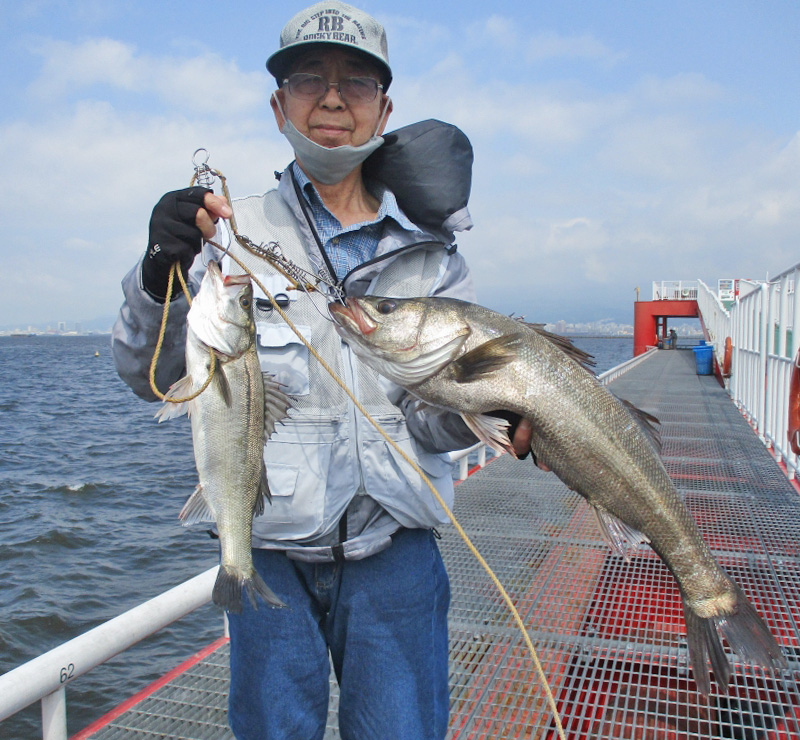 小林氏スズキ69.5cmとハネ43cm、そのほか、チヌ30cm、サッパ18cm頭に70尾、イワシ13cm頭に30尾。