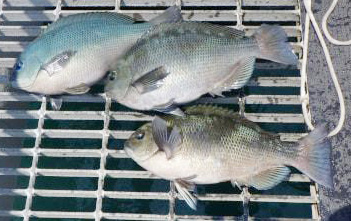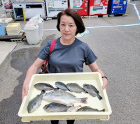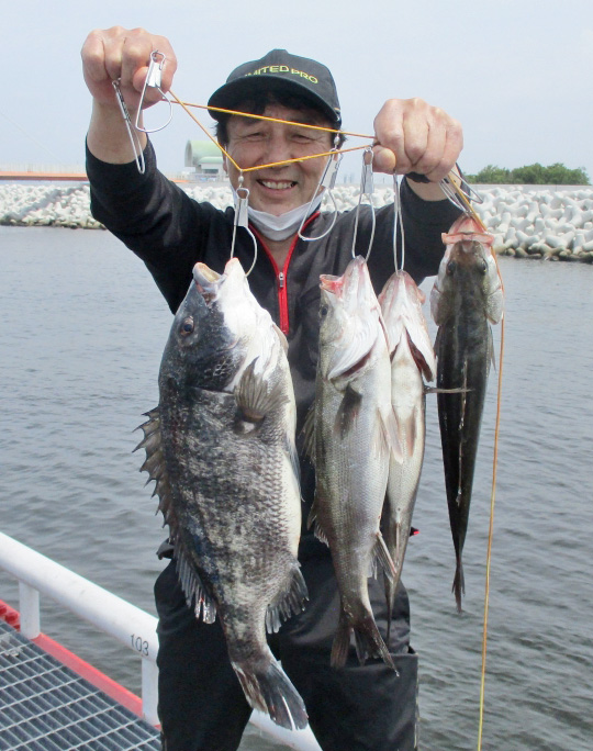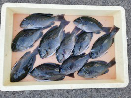 ヒラメ30cm頭に3尾、グレ35cm頭に24尾、チヌ46cm頭に12尾、アジ23cm頭に多数、イサギ20cm頭に4尾。