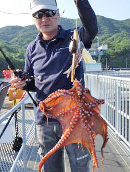 ヒラスズキ50cm、チヌ39cm、ガンゾウビラメ22cm、マダイ45cm頭に5尾、グレ29cm頭に2尾、ヒラメ29cm、イシダイ33cm、ガシラ20cm頭に3尾、カワハギ16cm頭に多数、ウマヅラハギ27cm頭に2尾、マダコ800g頭に2ハイ、オコゼ25cm、メバル18cm頭に多数、アジをサビキ釣りとカゴ釣りで。